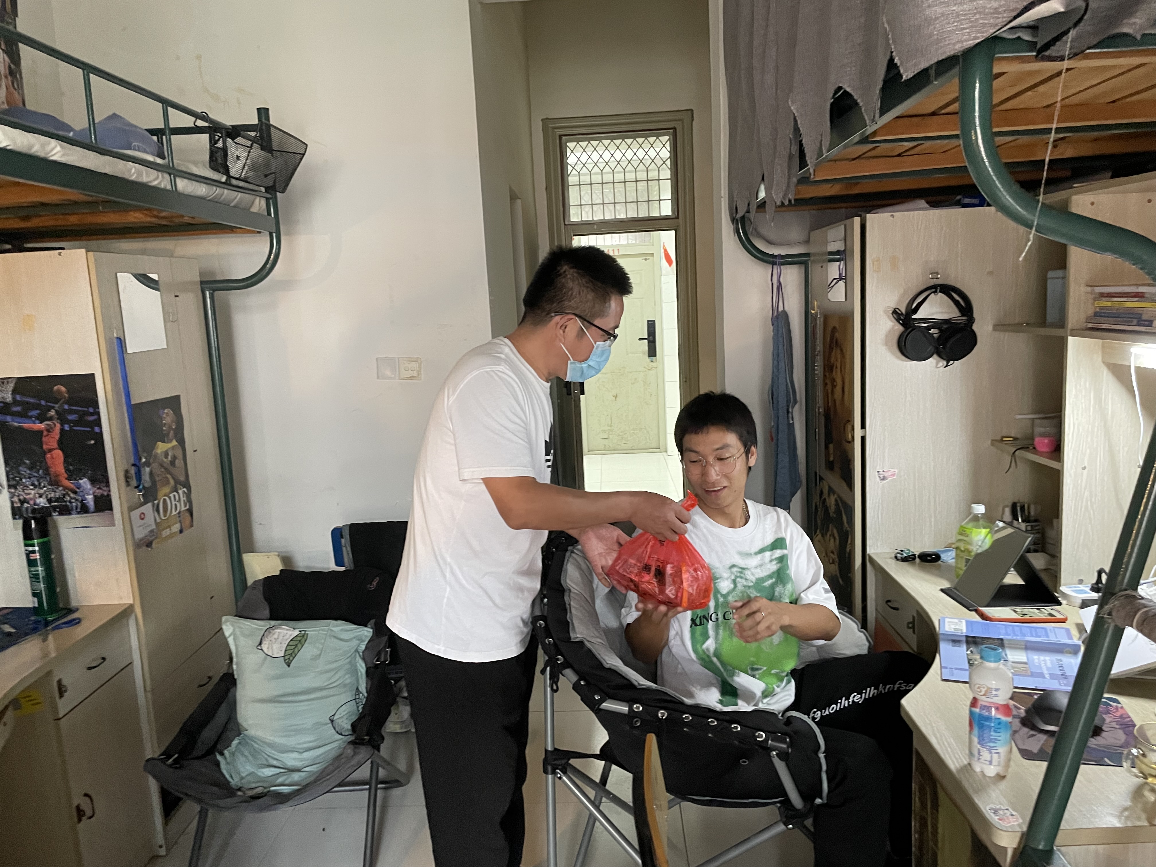 在月饼发放现场,杨之武及值班辅导员有序将这份饱含温情的节日礼品一一发放到学生手中,随后走访宿舍,关切询问在校生的生活、学习情况。