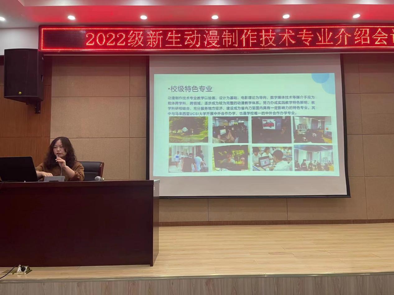 为促进2022级新生对所学专业进行认识和了解,让新生更快明确学习目标与方向,合理规划大学学习与生活。9月27日,传媒与设计学院在南阶205教室召开专业介绍大会,会议由动漫制作技术专业负责老师范文娟主持,动漫制作技术专业教师周苏亭、尚彩云、薛梦琪、郭伟、吴涛、阚迪、匡卓凡及2022级全体新生出席本次会议。