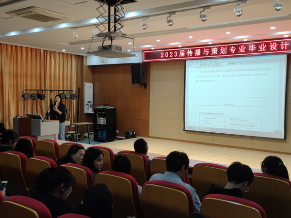 会上,李雯雯对毕业生毕业设计提出总体要求,明确了本届传播与策划专业毕业设计的主旨思想,即以“设计创新、服务设计、文化传承、岗位职责”为主旨,明确毕业设计时间,细化从2022年10月1日毕业设计动员起至2022年11月26日完成毕业设计答辩评定工作之间九项工作的时刻安排。就具体选题,李雯雯指出,毕业设计要求明确主题,提出创业、城市形象或校园形象推广、公益推广三大专题供学生参考选择,明确毕业设计提交内容及四项具体要求,并强调禁止抄袭,保证作品的原创性。李雯雯强调,要明确毕业设计成绩评定标准,以学生完成任务的过程和成果为依据,采取百分制评价,过程评价、成果评价、答辩评价的分值构成比为2:6:2。