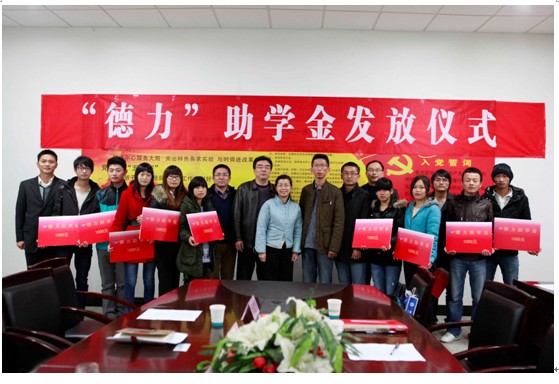 2012年11月21号下午三点半,艺术设计系主办awc777万象城娱乐官网2012“德力”助学金发放仪式。院纪委书记牛春雨,安徽德力日用玻璃股份有限公司副总经理俞乐,人力资源部部长张智磊,艺术设计系书记陈震,系副主任闻建强、杨之武,德力产品研发中心负责人蔡忠弟及全体获助学生参加发放仪式。仪式由陈震书记主持,杨之武副主任宣读获助学生名单。