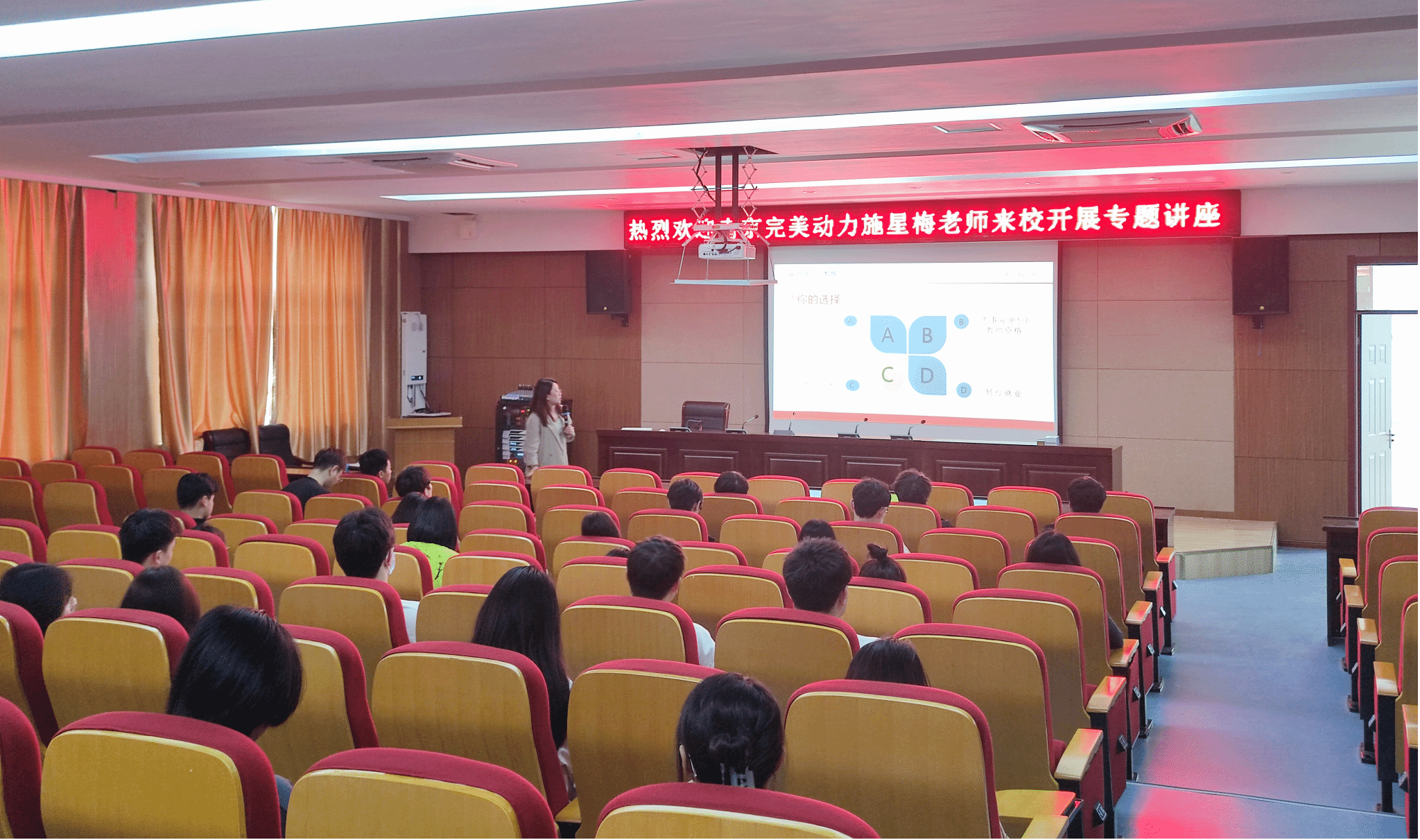 施星梅老师,南通大学广告专业,2015年就职于南京完美动力,主要负责大学生职业规划,大学生就业相关职位。讲座中,施星梅老师先后通过“CG制作”“CG行业是什么”“CG视觉效果的发展”“CG行业的发展前景”和“CG行业未来我们可以做什么”等几个板块为同学们展开介绍。