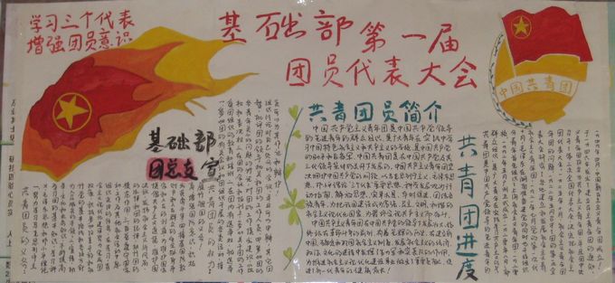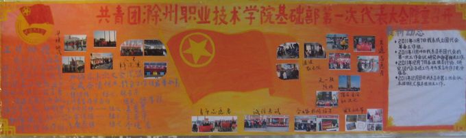 宣传组组织王亚平同学联合学生会宣传部部长及组员共同赶制了一期以回顾基础部团总支组建以来主要工作为主题的大型墙报,墙报设计主题突出、色彩鲜明,向全系团员宣告了团代会即将召开。