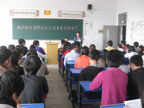2011年10月22日上午九点在我院2209教室,隶属于上海商景集团的安徽荣捷化工有限公司全椒分公司来我院招聘,主要招聘对象是基础部09级化工和高分子专业的学生。