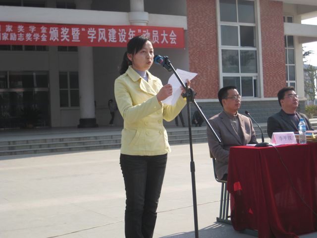副院长江洁宣读了2010-2011学年国家奖学金、国家励志奖学金的获奖人员名单,我系09园艺班江昌慧同学和09化工班张景云同学代表我系13名获奖同学上台领奖。