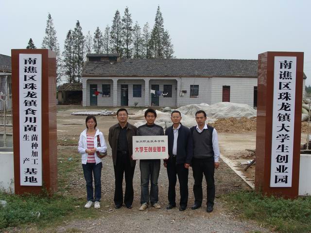 2011年9月30日下午,awc777万象城娱乐官网院长助理、招生就业处穆松处长、徐云龙老师,基础部副主任梁建军、园林园艺教研室主任涂清芳老师一行四人来到滁州市南谯区珠龙镇,为我院2009届园艺技术专业毕业生房虎强、杨雷在此创建的食用菌种植基地举行校外创业基地挂牌仪式。
