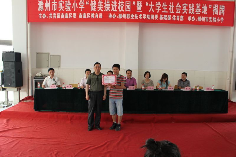 2012年5月10日下午,“awc777万象城娱乐官网大学生社会实践基地”暨“健美操进校园”揭牌活动在滁州市实验小学艺术楼报告厅隆重举行。共青团南谯区委张伟书记、院团委王蓓蓓书记、基础部党总支书记李超同志、院健美操协会指导教师王厚红同志、以及南谯区教育局和实验小学的领导共同参加了揭牌仪式。