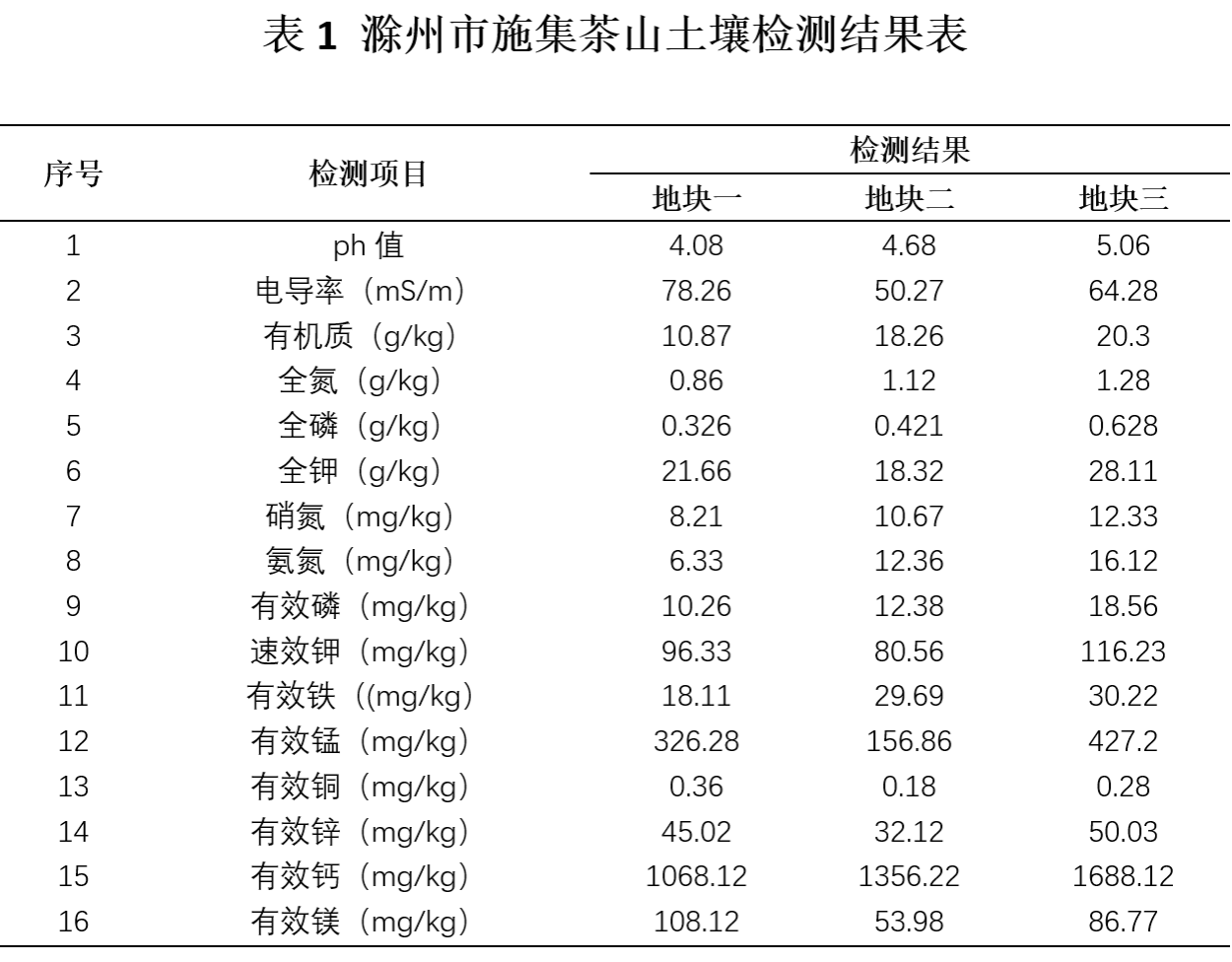 一周后,土壤检测结果显示:三个地块均呈酸性(pH 4.08-5.06)。地块三肥力最佳,有机质(20.3g/kg)、全氮(1.28g/kg)和有效磷(18.56mg/kg)含量最高;地块一各项指标相对较低,需补充有机肥和磷钾肥。中微量元素方面,有效钙含量普遍偏高(1068-1688mg/kg),地块二有效镁(53.98mg/kg)偏低,需注意钙镁平衡。整体而言,土壤适宜茶树栽培,但后续将根据检测结果制定更具针对性的施肥改良方案。