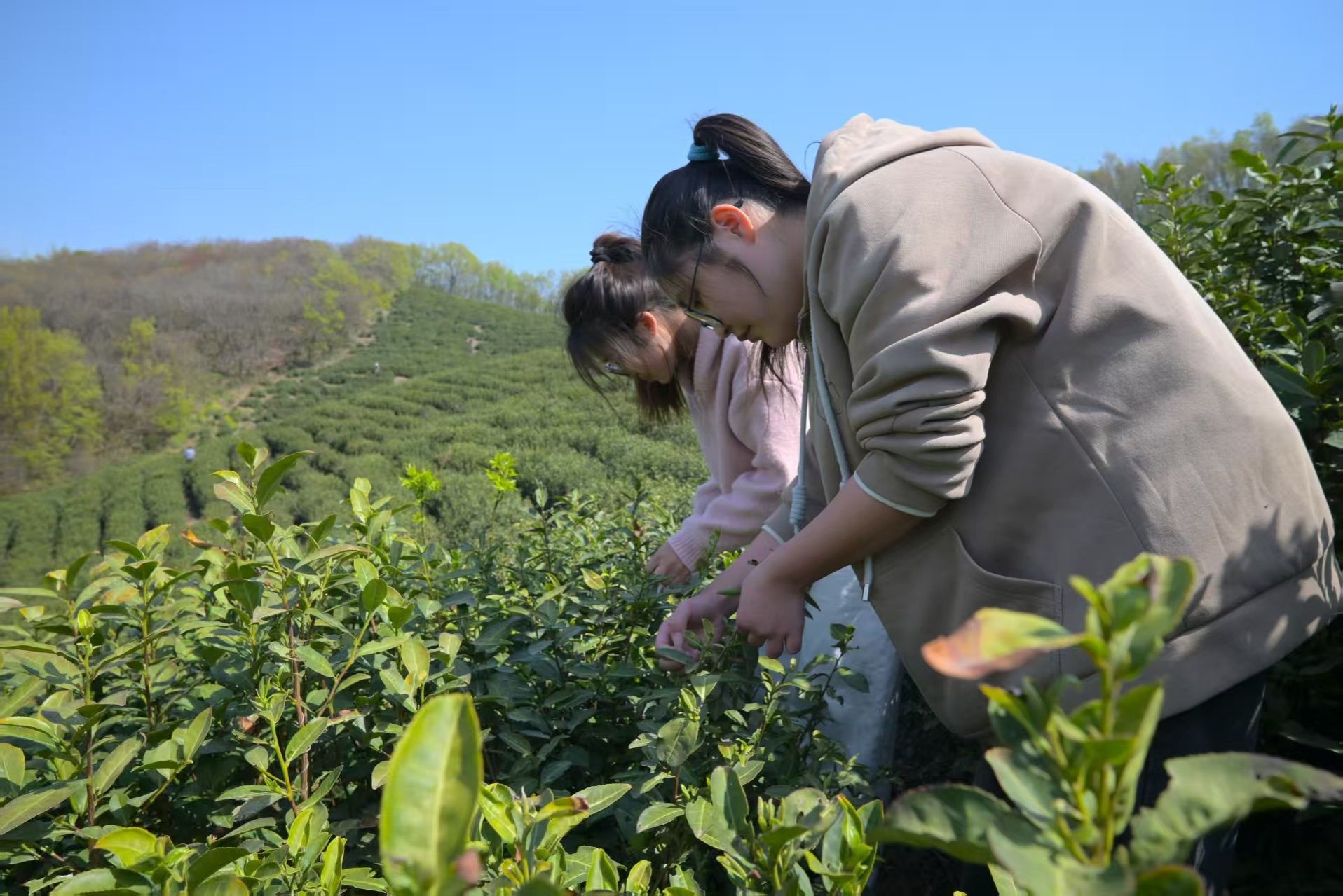 在专业课教师贾雪晴的带领下,园林专业的 30 名同学走进了茶园。放眼望去,满坡茶树新翠逼人,嫩绿茶芽在微风中轻轻摇曳。贾老师一边详细讲解茶叶的品种特性、生长周期,一边引导同学们仔细观察茶树形态,亲手触摸茶叶纹理,将课堂知识与实地观察紧密结合。讲解过后,同学们严格遵循 “一芽一叶”标准开始采摘,他们小心翼翼俯身,手指在枝头灵活舞动,嫩绿的茶芽便落入掌心。