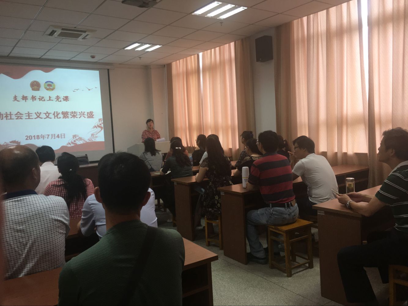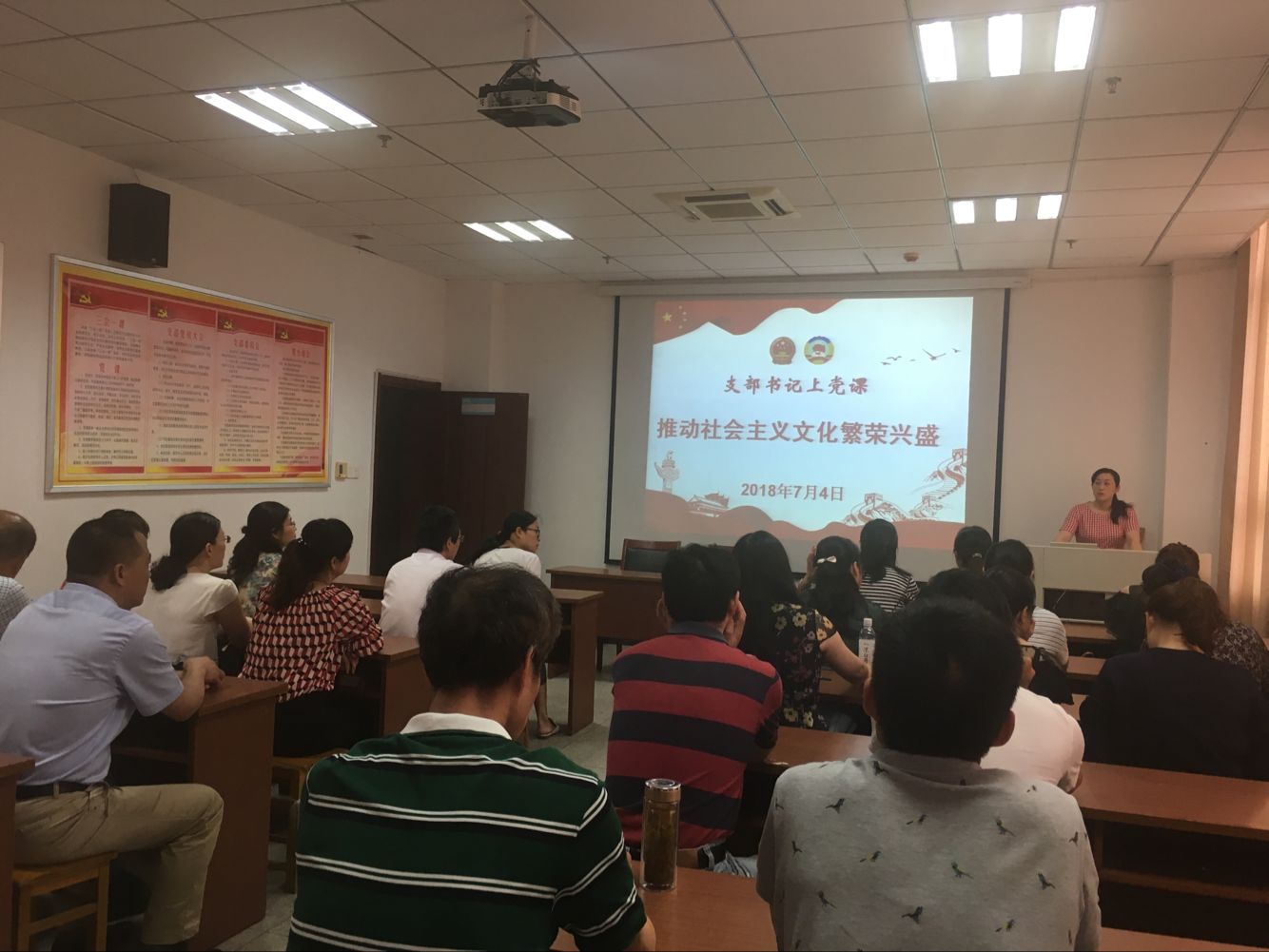 教工一支部书记宋园则围绕推动社会主义文化繁荣兴盛是新时代坚持和发展中国特色社会主义、实现中华民族伟大复兴中国梦、实现人民对美好生活向往、提高国家文化软实力的必然要求进行讲解。当前推动社会主义文化繁荣兴盛,就需要着力推动习近平新时代中国特色社会主义思想深入人心、着力培养担当民族复兴大任的时代新人、着力提高全社会文明程度。并强调指出,习近平总书记所作的党的十九大报告站在时代和全局的高度,深刻阐述了文化和文化建设的地位作用,深刻阐明了在新时代以什么样的立场和态度对待文化、用什么样的思路和举措发展文化、朝着什么样的方向和目标推进文化建设等重大问题,为推动社会主义文化繁荣兴盛、建设社会主义文化强国提供了根本遵循。