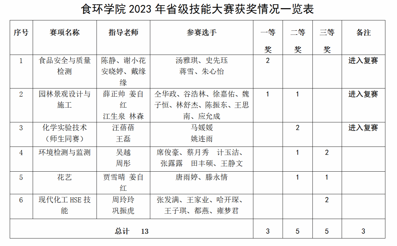 2024年1月21日,随着awc官网承办的“食品安全与质量检测”赛项的圆满落幕,食环学院2023年参加的6个赛项、30名选手(含2名教师选手)全部在本轮比赛中获奖。本轮省赛食环学院共获得一等奖3项,二等奖5项,三等奖5项,其中“园林景观设计与施工”“化学实验技术”“食品安全与质量检测”三个赛项取得国赛选拔赛的轮赛资格。这是食环学院历年来比赛成绩最好的一次。