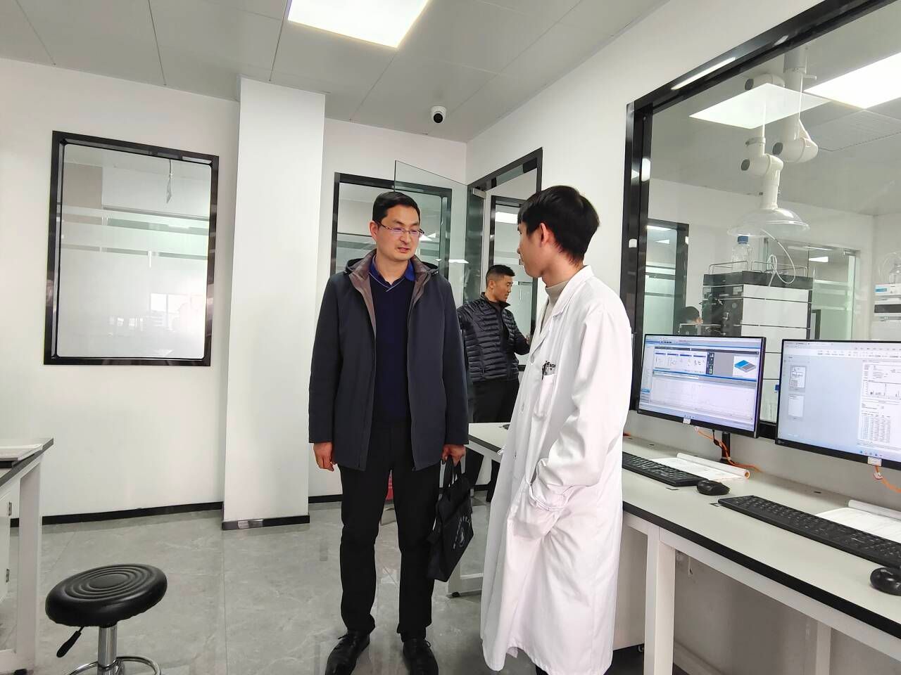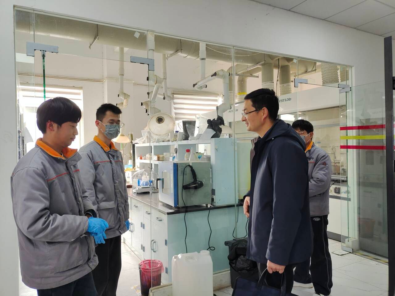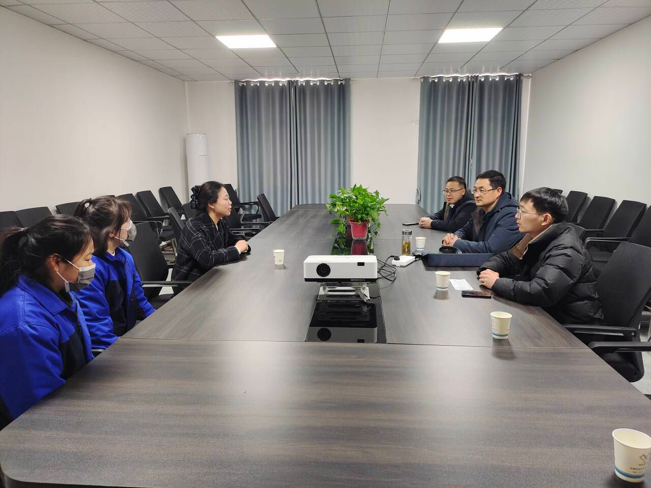 在通用生物(安徽)股份有限公司,孟飞一行与企业负责人、实习学生座谈交流,关心学生的工作和学习情况。了解企业用人需求,开拓更多工作岗位。