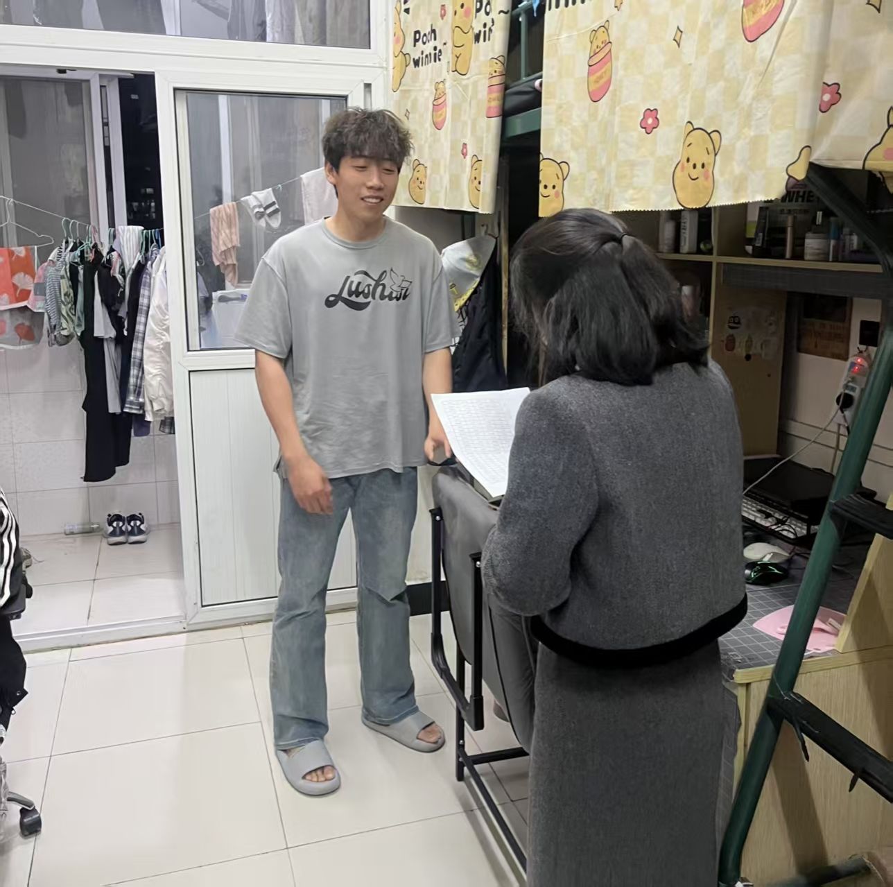 王静深入校内学生宿舍,与学生交流,详细解答学生思想、学业及生活问题,摸排安全隐患和电信诈骗线索,叮嘱同学们增强安全意识,自觉禁用明火和违规电器、学习防骗知识,守护好生命和财产安全。