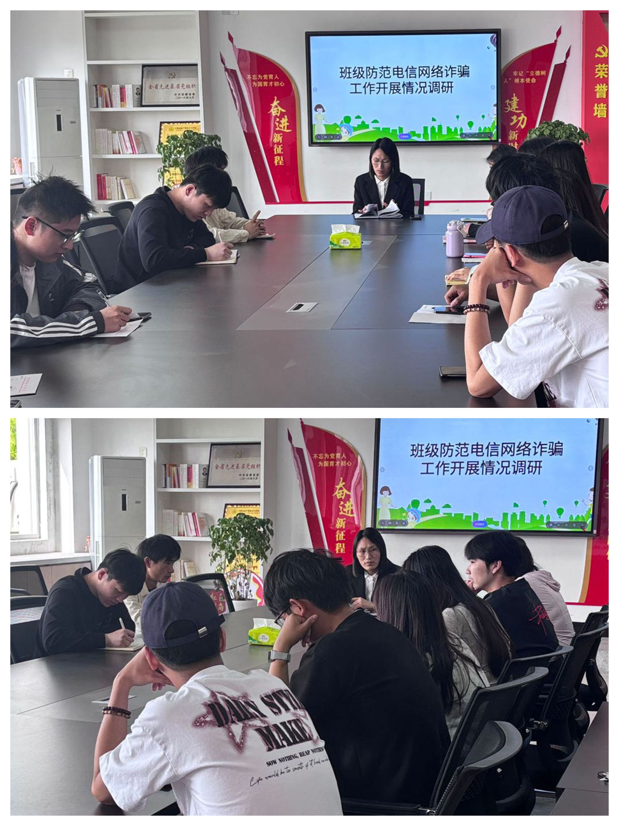为了解班级防范电信网络诈骗宣传教育工作开展情况,进一步筑牢校园安全防线,食环学院于4月10日上午组织召开“防范电信网络诈骗”专题座谈会,学院党总支书记张功会、团总支书记施明远与各班学生代表面对面座谈交流。