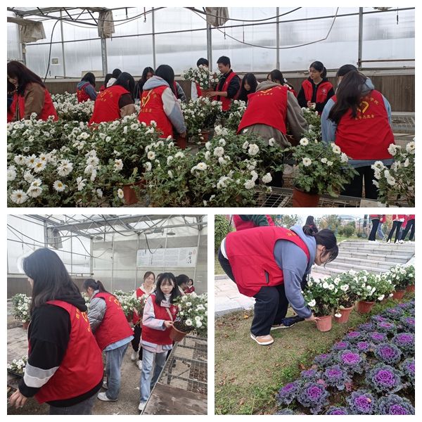 活动现场,在芳香四溢与愉快和谐气氛中,开启活动的菊花布景阶段,志愿者们手捧一盆盆错落有致、生机盎然的菊花,到达花坛前,有序地装饰起来。活动结束后,他们看着自己的劳动成果,内心表示十分的欣慰与喜悦。
