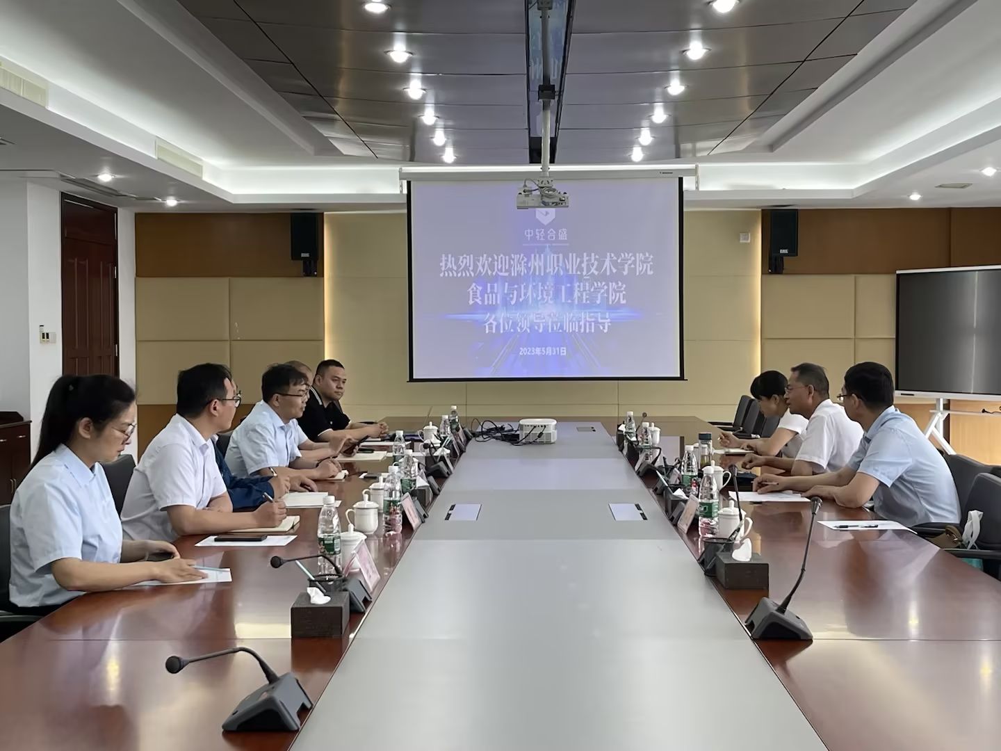为进一步明确食品类专业办学方向,加快食品检验检测技术专业群建设,落实滁州市职业教育工作部门联席会议关于建立专业(群)链服务产业链工作机制的通知精神,5月31日上午,食品与环境工程学院院长梁建军、副院长孟飞、食品科学系主任陈静及专业负责人谢小花等一行赴中轻合盛科技有限公司调研交流。中轻合盛科技有限公司总经理张涛、总经理助理兼技术服务中心主任朱向东、办公室主任任波等热情接待了梁建军一行。