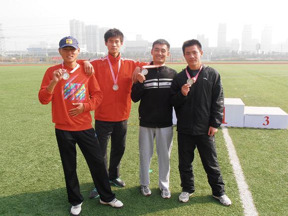 男子甲组4×100米:魏志强、周杰、李启星、赵陈荣获第二名;