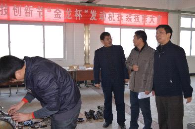 为了巩固学生的专业知识,提高学生的专业技能,并为省职业技能大赛选拔了人才,2012年11月17日上午,汽车工程系在7号实训楼二楼汽车实训中心,举办了由滁州通用五菱4S店冠名的第九届科技创新节“金龙杯”发动机拆装技能大赛。