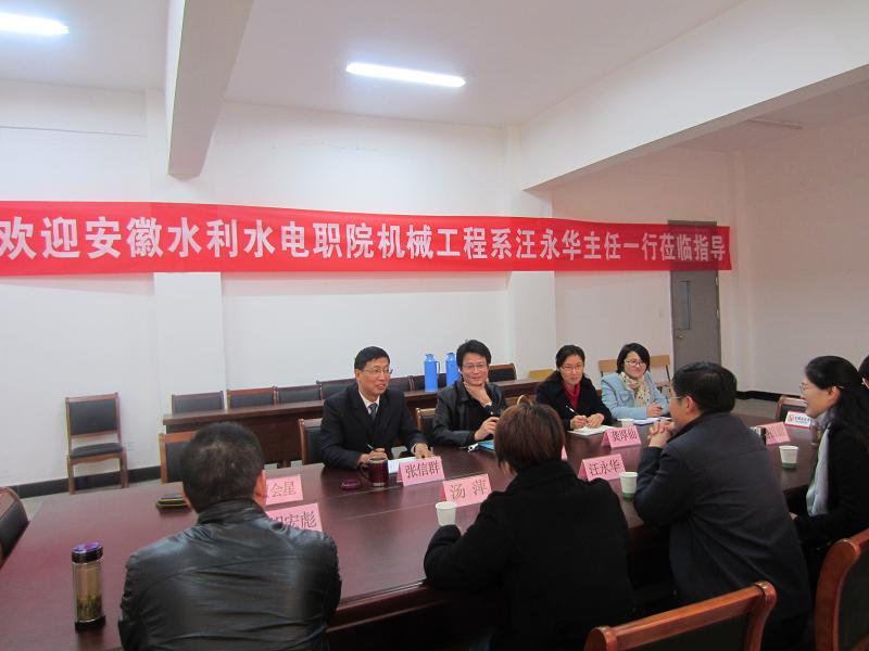 汪永华主任介绍了安徽水利水电职业技术学院机械工程系的基本情况,对我院汽车系以较少的教职工能够承担近1400名学生的教学和管理任务表示惊讶和赞赏,对汽车系教职工的工作干劲和奉献精神给与了高度评价。他指出awc777万象城娱乐官网的模具专业是央财支持专业,在省内享有较高知名度,该专业建设方案有很好的参考作用,本次来就是要亲身感受一下该专业的软、硬件。双方教师还就模具专业及相关专业的建设和改善实训条件等内容进行了充分的研讨和交流。