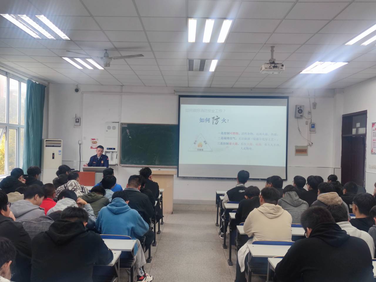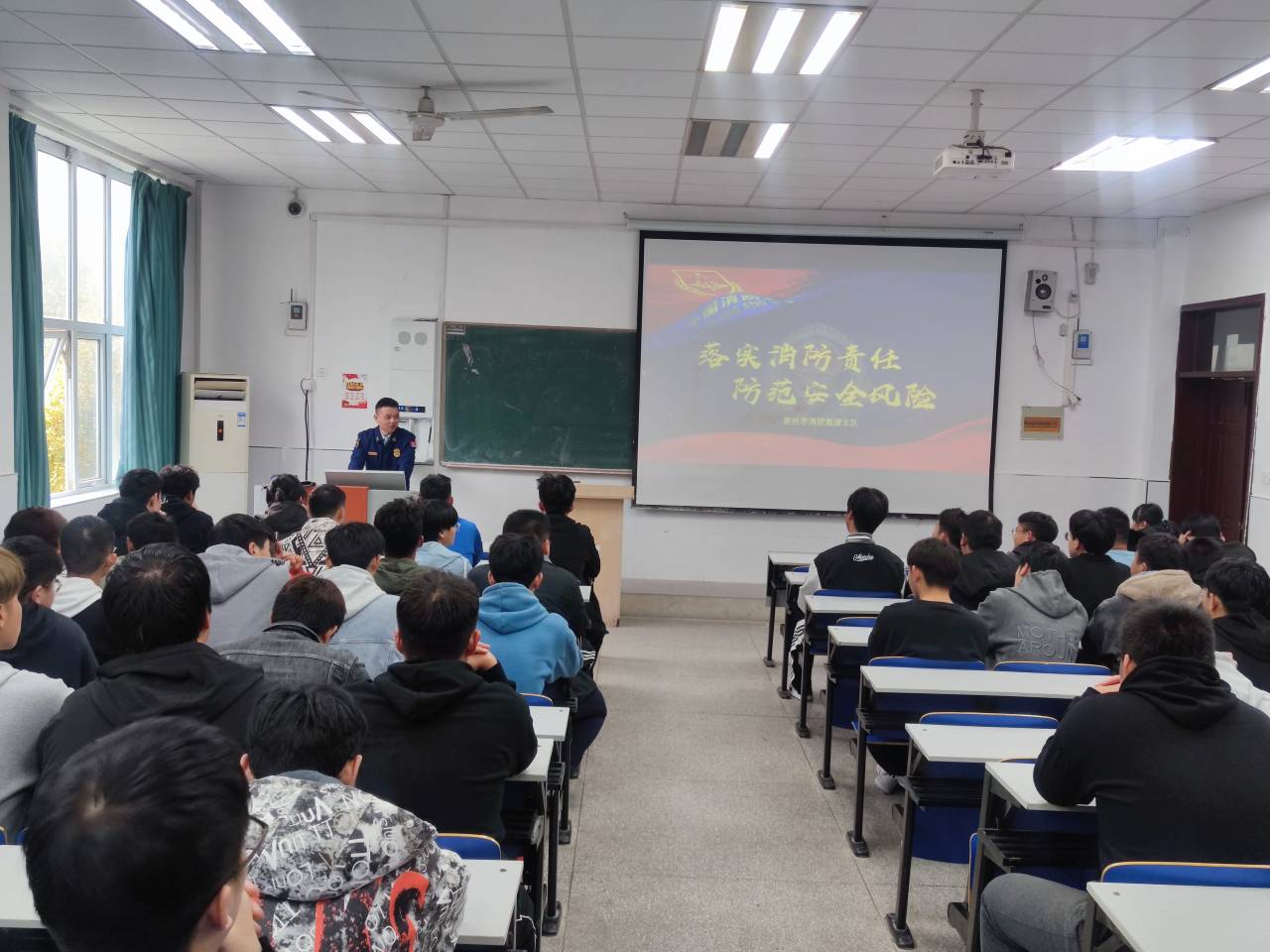 活动现场,滁州市消防救援支队王参谋对防火灭火知识的重要性和必要性、火灾的预防措施、发生火灾时的应急措施、初期火灾的处置方法、逃生与自救的基本方法、常见消防器材的使用方法等进行了详细的讲解。同时叮嘱大家要将消防安全知识和生活紧密结合,不断增强自身消防安全素质,注意日常用火、用电、用气安全,避免火灾事故的发生。进一步增强了同学们的消防安全意识,提高了安全自救和抵御火灾的能力。