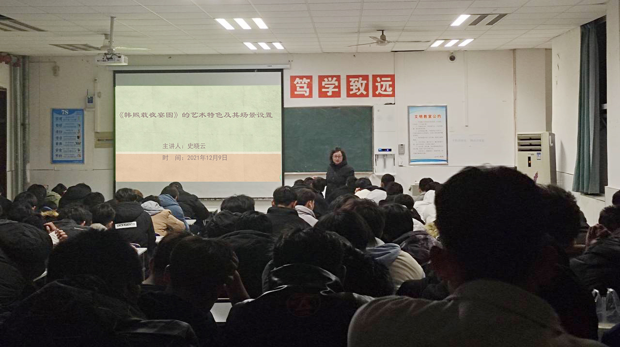 为了提升学生审美情趣和艺术鉴赏力,2021年12月9日晚,机械与汽车工程学院在致学楼4110教室举办了一场题为“《韩熙载夜宴图》艺术特色及其场景设置”的学术讲座,本次讲座特邀史晓云副教授主讲,机械与汽车工程学院21级百余名学生聆听了讲座。