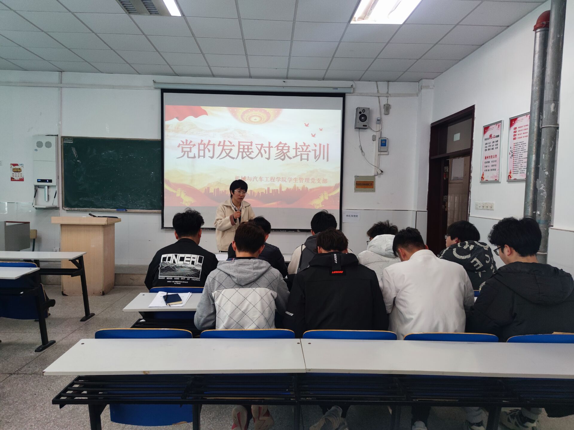 为进一步提升发展对象的思想觉悟和政治素养,2022年3月2日,机械与汽车工程学院学生管理党支部在5113教室开展党的发展对象培训,学生管理党支部书记吴佳佳主讲,党的发展对象参加。