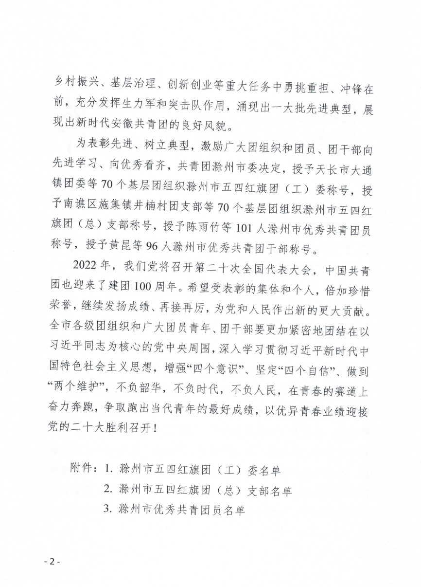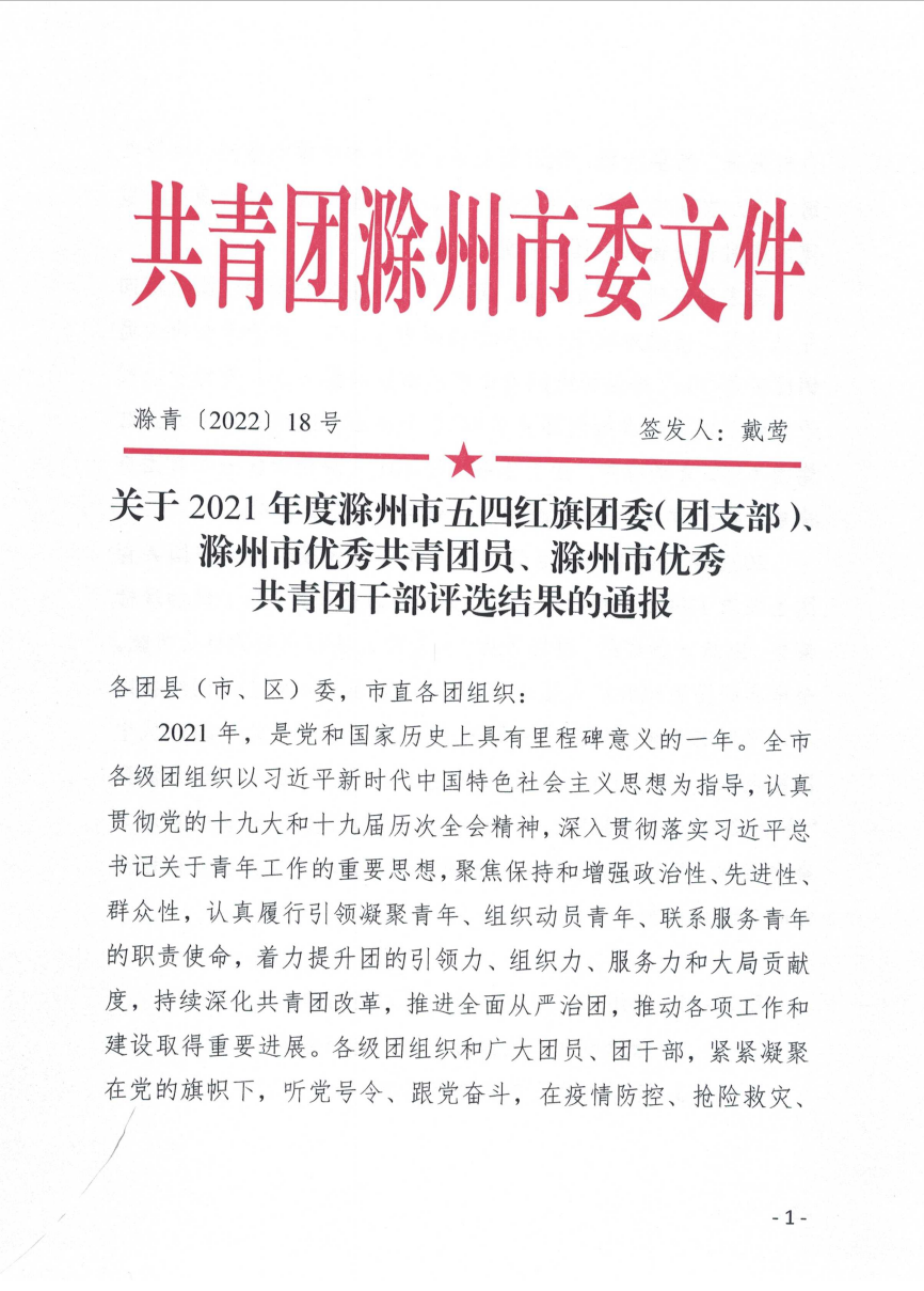 近日,团市委发布《关于2021年度滁州市五四红旗团委(团支部)、滁州市优秀共青团员、滁州市优秀共青团干部评选结果的通报》,我院团总支荣获“滁州市五四红旗团(总)支部”荣誉称号。