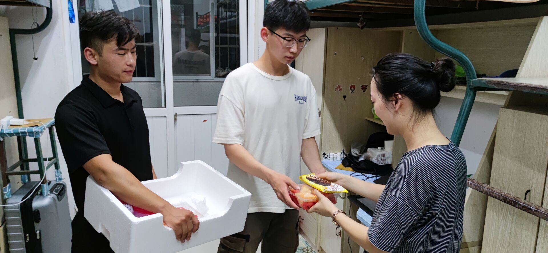 倪子旭老师和领队朱宾同学挨个走进了志愿者们的宿舍,为志愿者们送上新鲜的水果以及解暑的雪糕,并嘱咐他们夏日炎炎,在完成省十五运志愿工作的同时,要注意休息,严防中暑,身体健康是永远排第一位的。通过与志愿者们的亲切交流,详细了解了他们在志愿服务工作和生活情况,对志愿者们无私奉献的精神表示赞赏。