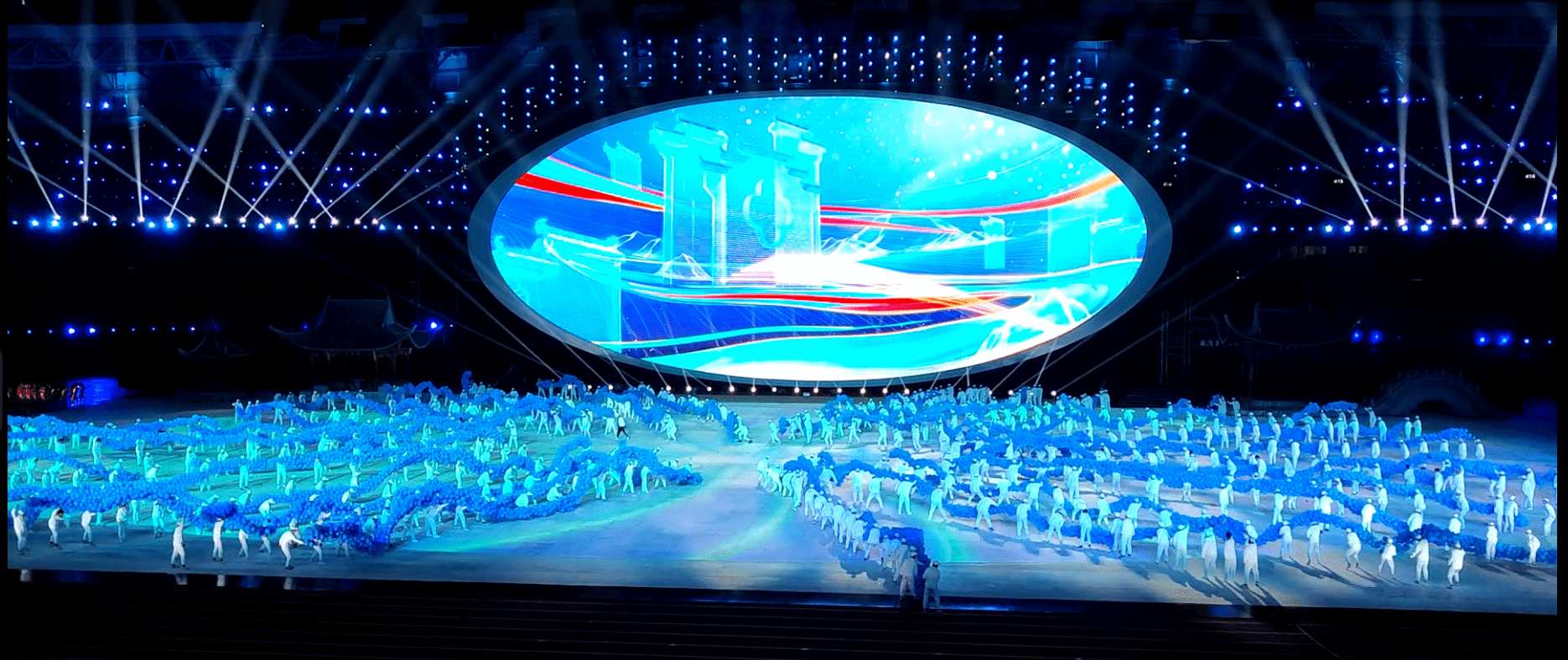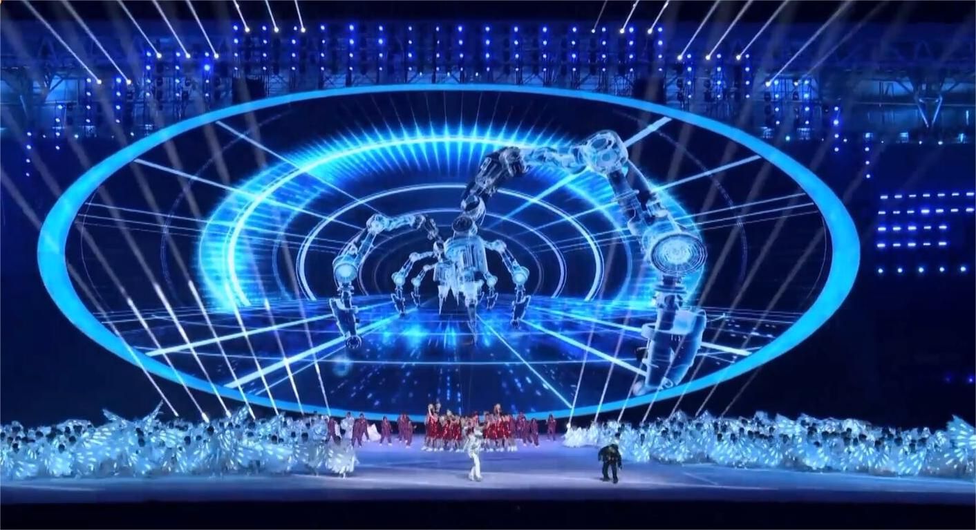 开幕式中,参加《超越·向未来》的同学高举蓝色气球龙组合铺展成长江与淮河的形状,宛如两条驭风的巨龙光影流动,一棵硕大的迎客松张开怀抱欢迎五方来宾;《逐梦之光》的律动表演与激情音乐惊艳全场,同学们挥舞着翅膀追逐科技之光。