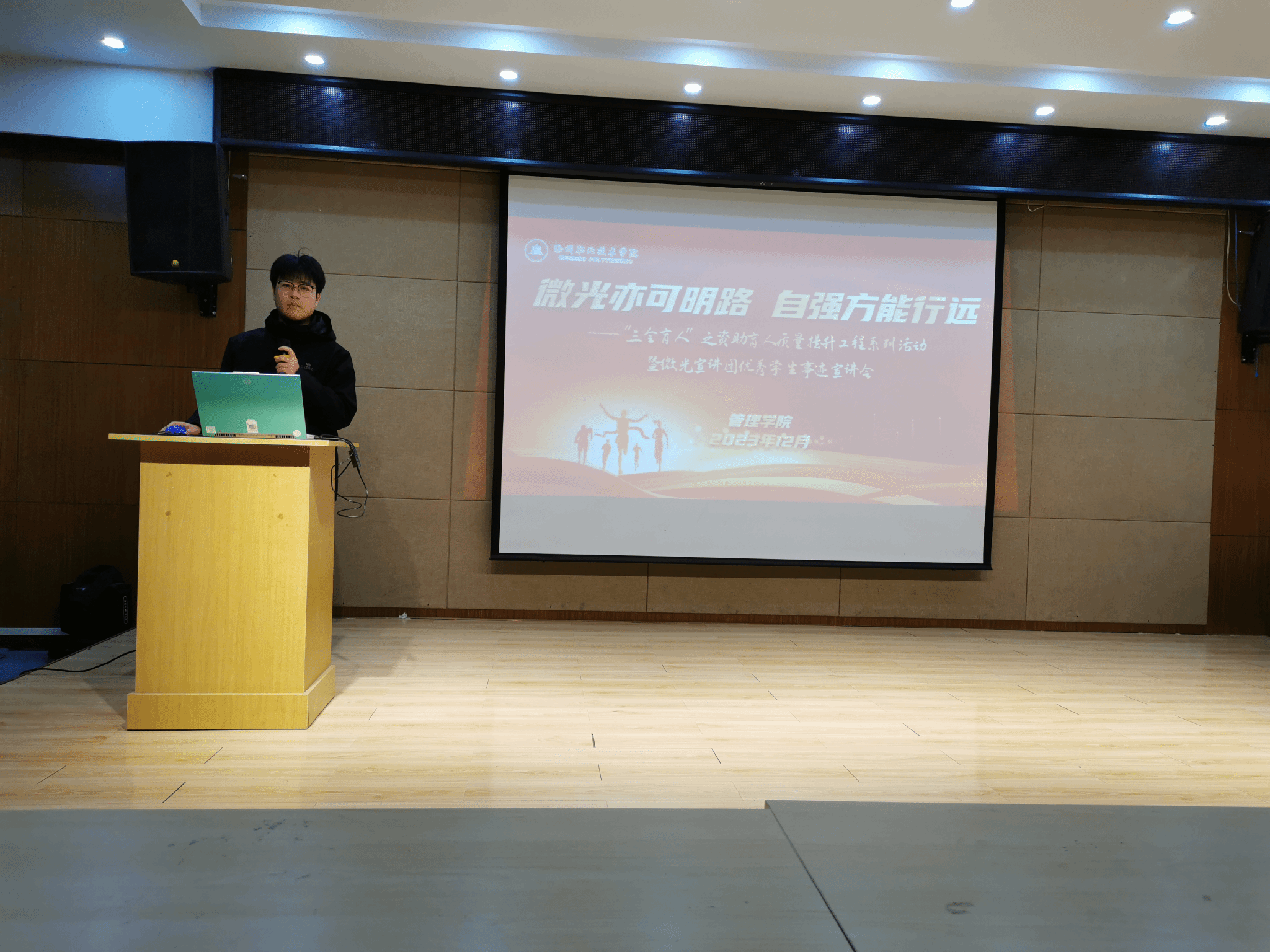 榜样激发动力,努力沉淀实力。为了进一步营造良好的学习氛围,激励同学们自立自强、拼搏向上,帮助同学们破解迷茫、化解焦虑、锚定目标、坚持不懈向前奋斗,管理学院“三全育人”之资助育人质量提升工程系列活动暨优秀学生事迹报告会于12月12日-13日在南阶203分批次举行。院党总支书记耿学刚、部分专职辅导员出席活动,2023级400余名学生参加。