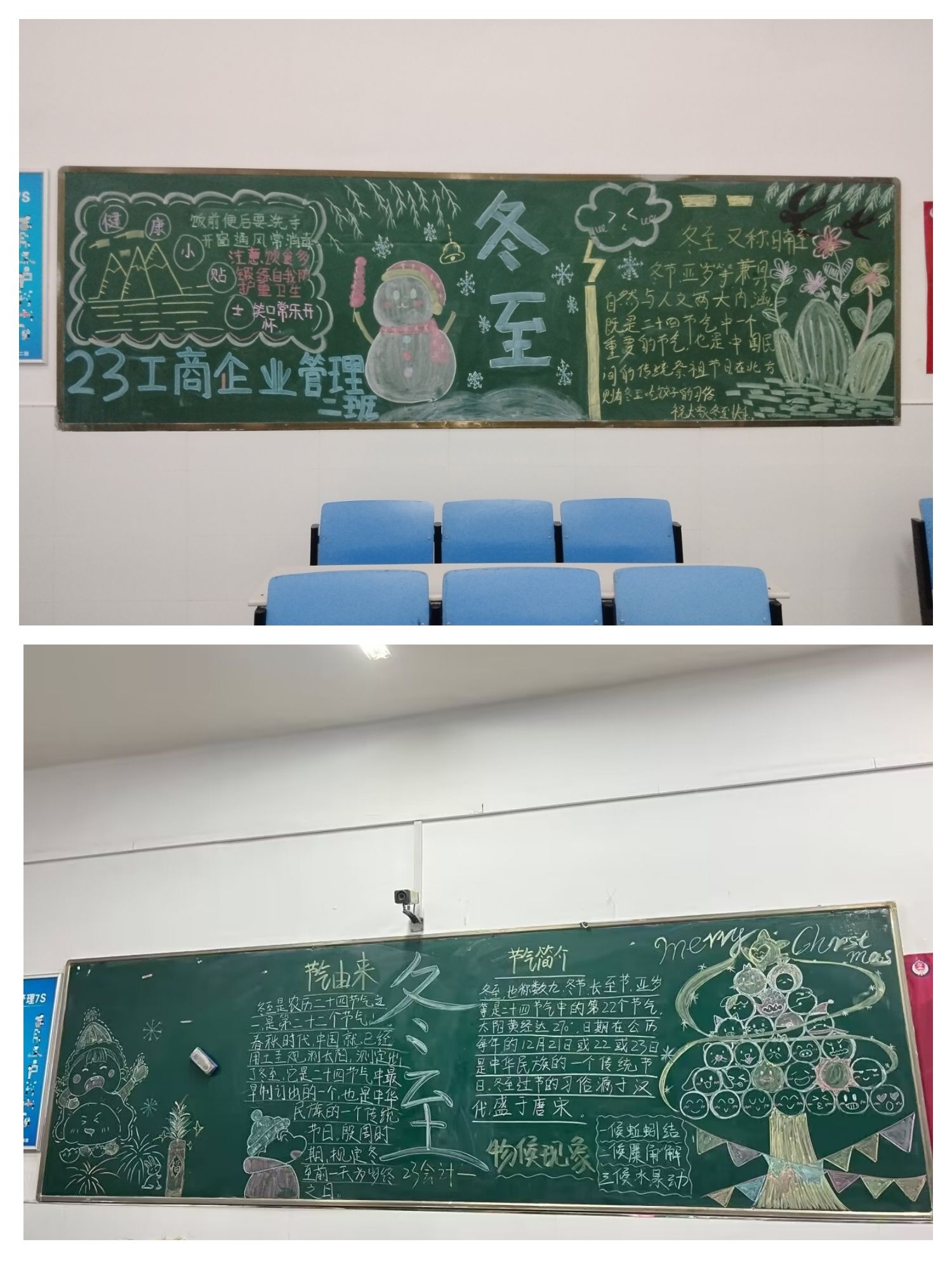 活动正式开始,各班同学迅速投入到工作中。有的负责画画,有的负责写字,还有的负责布局规划。同学们都积极参与,发挥创意,用粉笔勾画出一幅幅排版美观、紧贴主题的黑板报,在班级里营造了浓厚的节日氛围,增添了一份冬至节日的气息。经评比,23会计四班荣获一等奖,23旅管二班、23财管二班荣获二等奖,23旅管三班、23会计一班、23财管一班、23工企二班荣获三等奖。