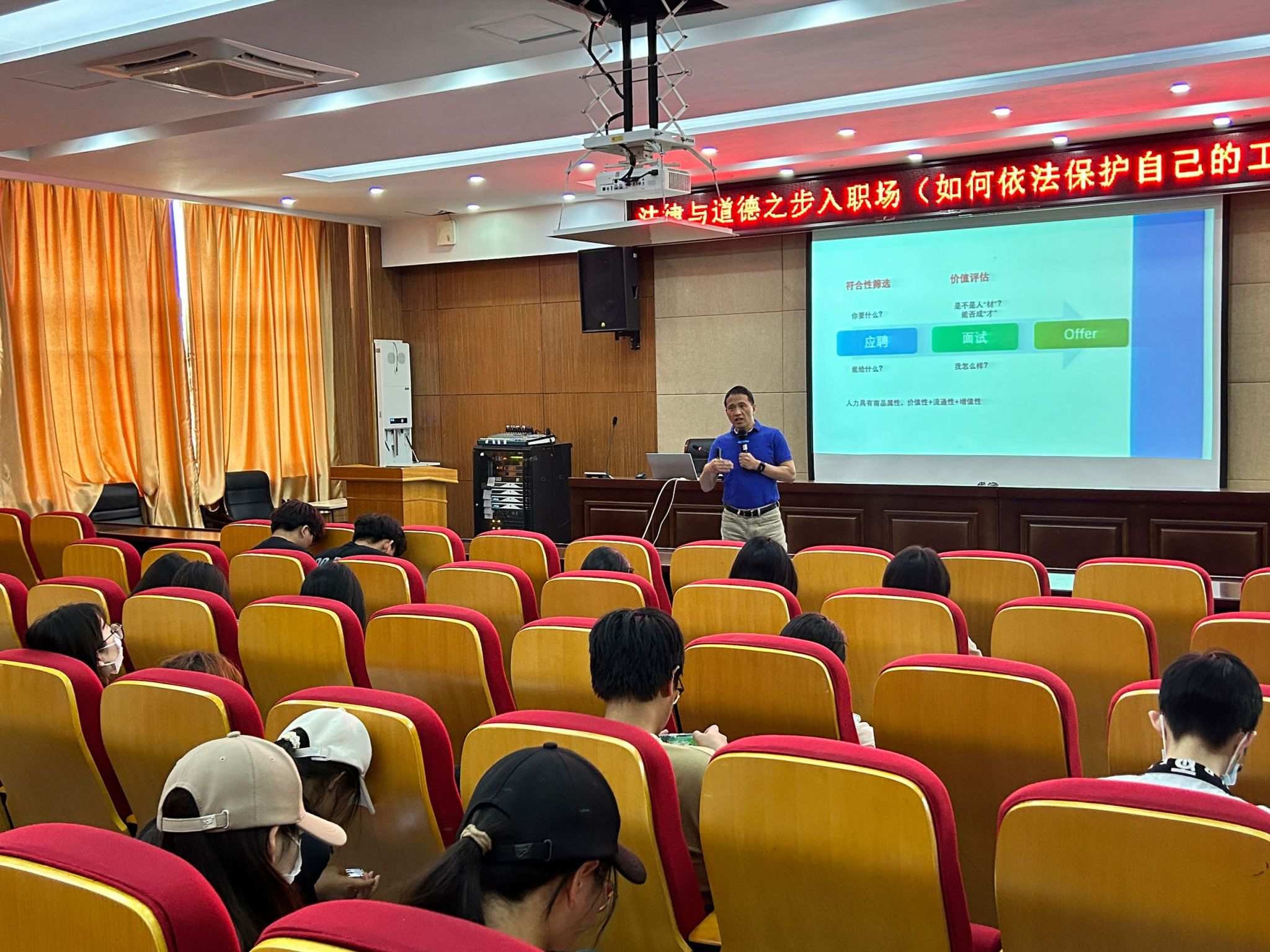 2024年5月29日,管理学院在南阶205教室开展大师进校园活动。我院荣幸地邀请到天津财经大学EMBA管理学硕士徐文中老师,为同学们带来“法律与道德之步入职场”的讲座。在讲座中,徐文中大师深入浅出地讲解了劳动法、合同法、知识产权法等职场中常用的法律知识。同时,用生动有趣的案例,以及详实的案例分析,帮助我们的同学们理解了法律与道德在职场中的关系,以及如何运用法律和道德来保护自己的权益和声誉。