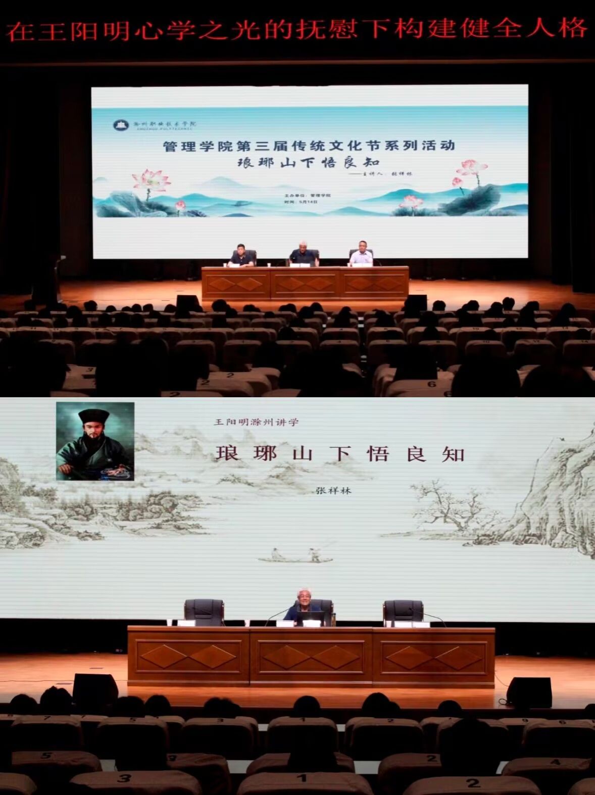 当日下午,“王阳明‘心学’讲座——琅琊山下悟良知”在6号楼报告厅率先开讲。滁州市地情人文研究会名誉会长、文史研究员张祥林担任主讲嘉宾,他围绕王阳明心学“心即理”“知行合一”“致良知”等核心概念,结合历史典故与现代管理案例,深入剖析心学思想的哲学内涵与现实意义。张祥林以琅琊山地域文化为纽带,讲述王阳明与滁州的历史渊源,生动展现心学在治学、修身、管理中的实践价值。现场互动环节,师生踊跃提问,围绕心学与当代职场、个人成长等话题展开热烈探讨,思想碰撞的火花不断。此次讲座搭建起师生与传统文化对话的桥梁,有力推动阳明心学等经典思想的传承创新。