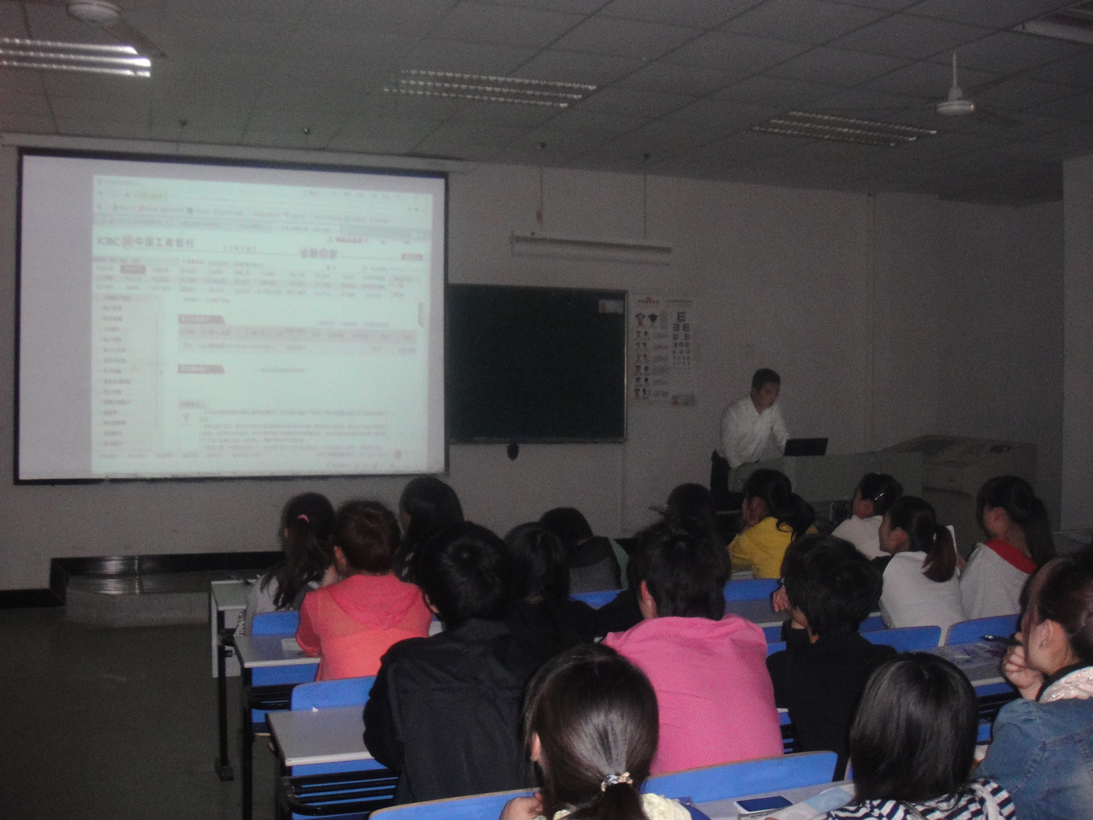 电子支付能力是电子商务专业实践能力的重要组成部分,为了使电子商务专业的学生对网上银行业务有更加深入的了解,进一步提升学生的网上支付操作技能。经贸系特地邀请滁州工商银行电子银行中心经理戴冰、滁州工商银行丰乐支行行长助理肖彬、客户经理李攀于2013年4月17日星期三下午在1101教室为我系2011、2012级电子商务专业的学生举办了电子支付技能讲座。