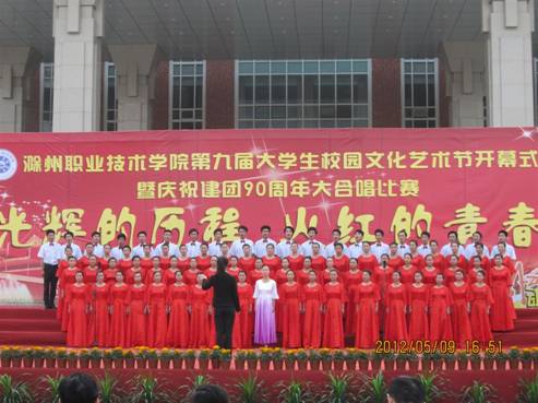 2012年5月9日下午四点,我系合唱队在学院广场参加了以“光辉的历程,火红的青春”为主题的学院第九届校园文化艺术节开幕式暨庆祝建团90周年大合唱比赛。我系合唱队经过长达一个多月的刻苦训练,用完美的合唱向全院师生展现了我系学生的青春风采。