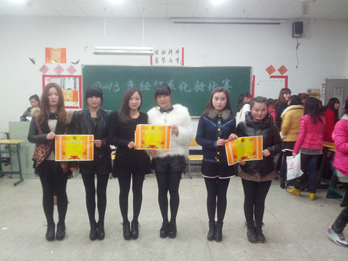 本场比赛共有十一组选手参赛,经过45分钟精心巧妙的装扮,三名选手脱颖而出,名列三甲。来自12级市场营销2班的徐琦睿同学、12级金融保险班的曹小芳同学和12级电子商务2班的张小蝶同学分获冠、亚、季军。最后,所有参赛选手合影留念,化妆比赛在欢快愉悦的气氛中落下帷幕。