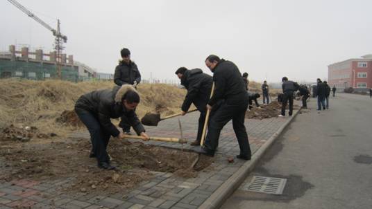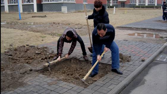 2012年3月2日上午,根据学校部署,为了迎接第33个植树节,加快新校区绿化建设,在党总支书记李怀成书记的带领下,经贸系全体辅导员、部分教师和系团总支、系学生会部分学生干部一起来到校园主干道,挖掘树洞,为3月11日植树活动做好准备。