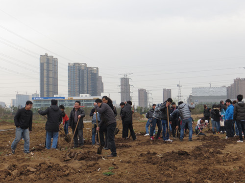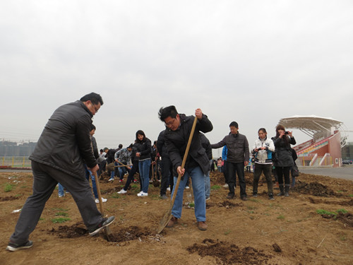 植树现场,师生们在不停的忙碌着,到处是挥锹刨土的热闹劳动场面。一个个树坑的挖成,都象征着一份份绿色的希望;每一滴汗水的流下,都代表经贸师生们的奉献与关爱。