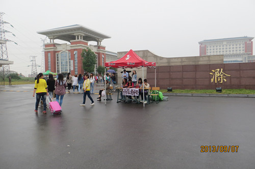 (志愿者在学院门口接待新生)