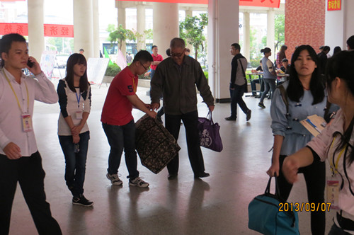 (志愿者热情的接过学生家长手中的行李)