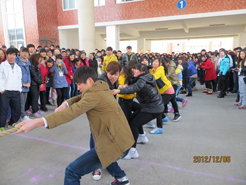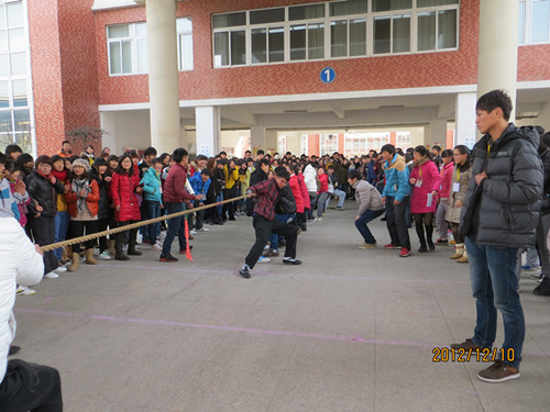 2012年12月10日中午12点半,经贸系拔河比赛决赛在经贸系大厅举行。在经过了初赛的选拔后有九个班级进入决赛。在比赛现场,各班秉着友谊第一比赛第二的原则,展开了激烈的角逐。各班拉拉队响起阵阵加油喝彩声,高潮迭起,气氛十分的活跃,同学们团结一致,奋力拼搏。最终会计八班勇夺桂冠,文秘班和会计二班获得第二、第三名,同时市场营销一班获得优秀奖。最后经贸系团总支何书记与获奖班级合影留念。