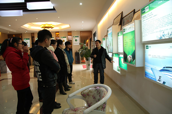 参观的第二站,在滁州市电子商务协会曹庆花秘书长的带领下参观了民江环保科技有限公司的竹知音产品体验馆。设计合理的体验馆布局、产品从原材料到成品的展示和温馨的公司文化给了同学们很深刻的印象。