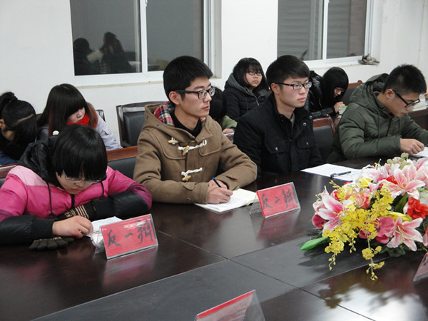 为了加深同学们对税收知识的学习,提高综合素质与能力,2013年12月26日下午5点,经济贸易系2012级会计5班在《税收实务》老师翁嘉晨的指导下,在经贸系会议室成功举行了最后一场税收辩论赛。