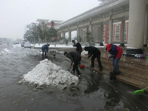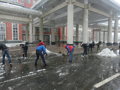 由于气候原因,校园被一层厚厚的积雪覆盖,为尽快消除大雪给广大师生出行造成的不便,在院团委的部署下,2014年2月18日下午经贸系团总支、学生会积极参加青年志愿者扫雪活动。