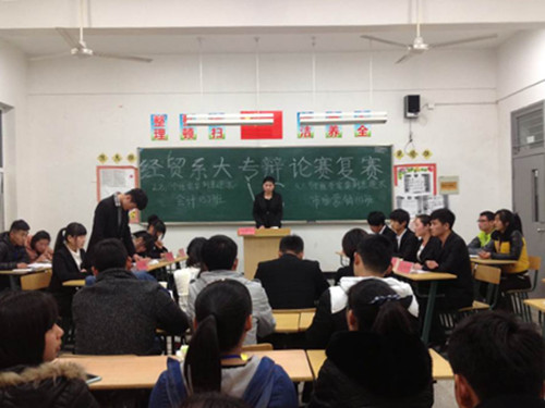 2014年3月11日晚,经济贸易系团总支、学生会第14届大专辩论赛复赛圆满结束。经过激烈的角逐,经贸系2013级旅游管理、国际贸易、市场营销(1)班、市场营销(2)班四个班级成功晋级总决赛。