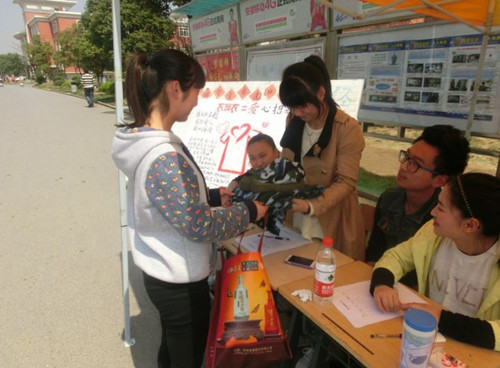 团学干们在女生宿舍一号楼下认真宣传爱心活动,吸引了同学们前来积极募捐。活动主要收集在校学生的衣物、书本、纸张、塑料瓶等废弃物品。