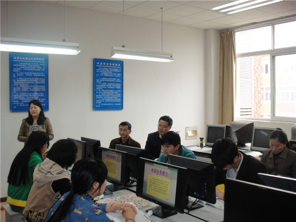 2014年4月18日上午,经贸系主任翁嘉晨、书记陈开兵及金融保险教研室主任吴孝文和教学秘书程震一起对本学期孙疏老师任课的《商业银行综合柜台业务》项目化课程进行了听课调研。