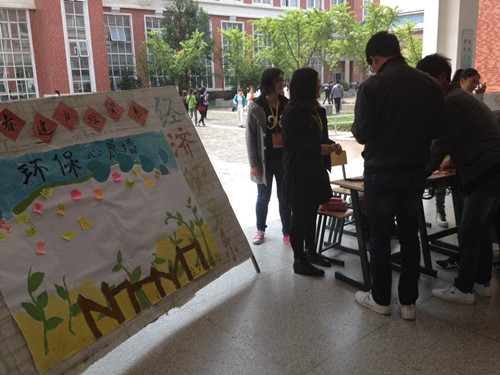为了增强同学们的环保意识,加深环保理念,2014年4月22日,经济贸易系团总支、学生会在致真楼开展“世界地球日,环保校园行”爱心活动。