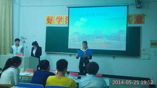 为了增强经贸学子的诚信意识,加强同学们的道德修养,2014年5月25日晚,经济贸易系团总支、学生会在经贸系教学楼1108教室开展了以“诚信教育”为主题演讲比赛。