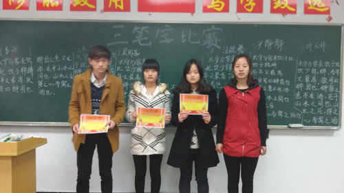 活动过程中,同学们十分积极、认真,奋笔疾书。经过紧张的比拼,最终,吴阶茹、叶玉婷、汪皖腾获得了粉笔字阶段的胜利,戚彩云、马王雪、苏方卉获得了毛笔字阶段的胜利,吴阶茹、夏文侠、许正雨荣获了硬笔字阶段的胜利,在此,祝贺他们。