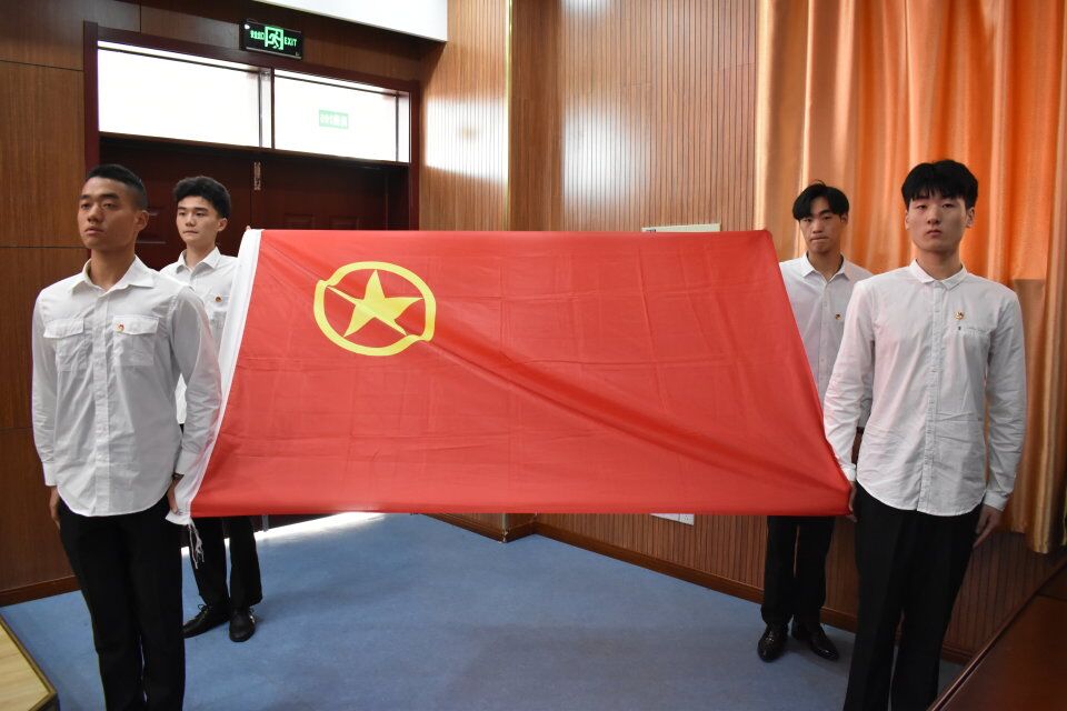 大会第一项放团歌。大会在庄严的团歌声中拉开序幕,接着举行新团员入团仪式,老团员重温誓词活动。